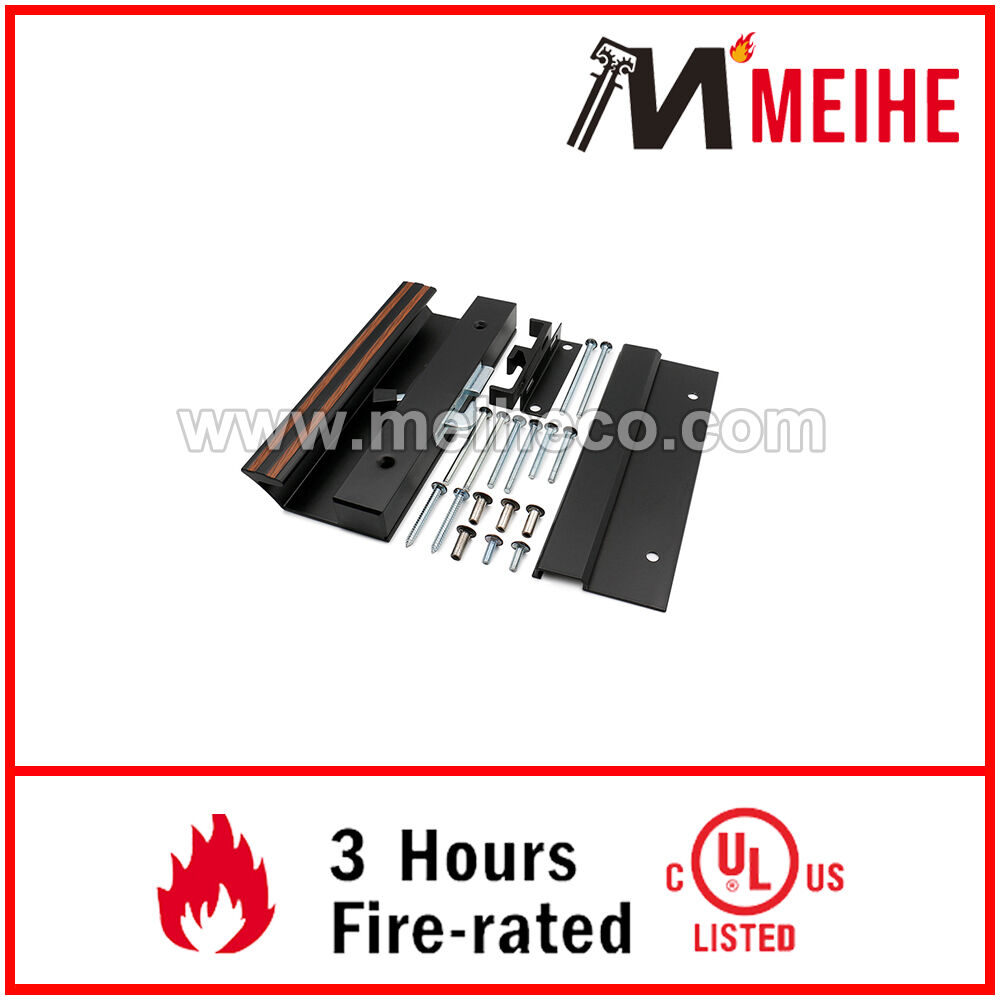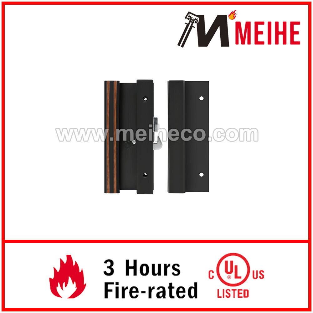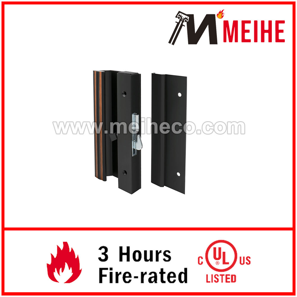It has a 1-1/2 inch high profile extruded aluminum Black finished inside handle with an anti-lift feature on the Hook Latch. The mounting holes are 4-15/16 inches apart. The outside handle is a low profile extruded pull with matching 4-15/16 inch mounting holes.