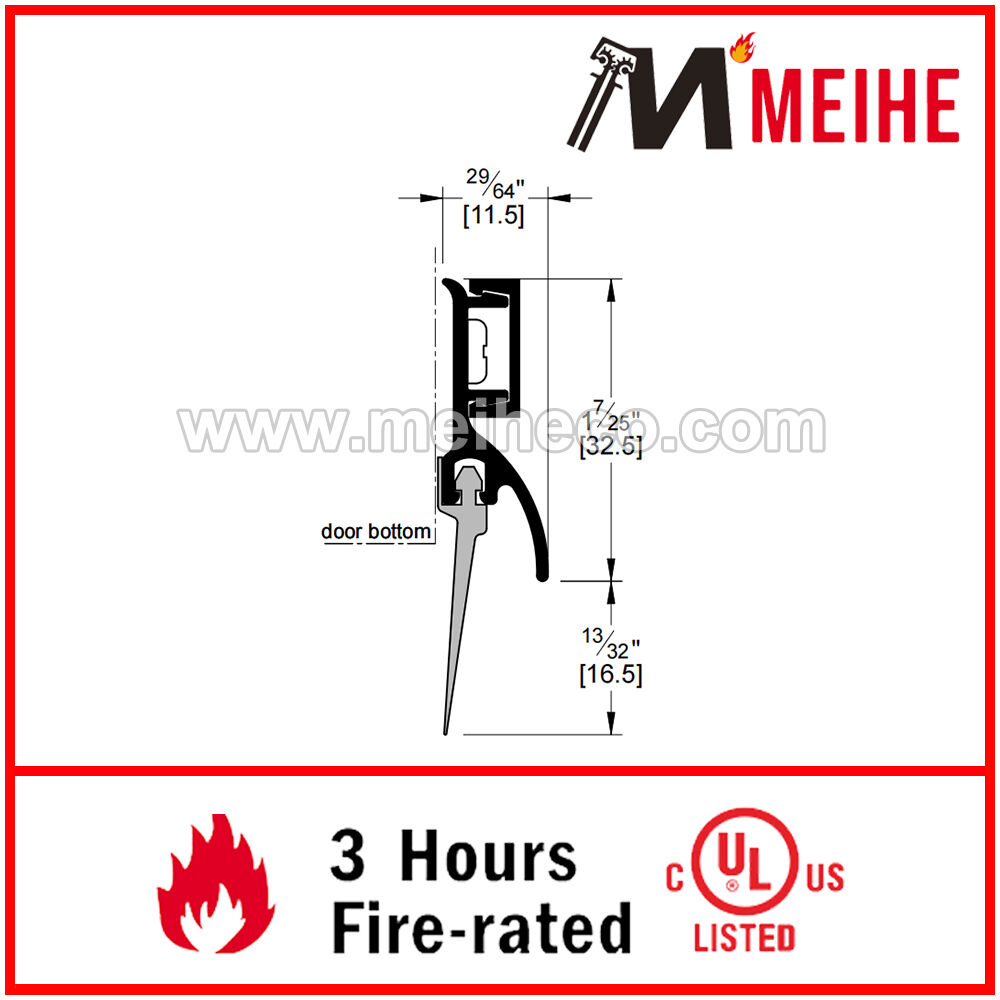 This door sweep can be used to seal up to a 13/20" the gap between the door and threshold or to the floor surface. It is fitted with a Vinyl extrusion. Its fire and smoke rated and can be rated for low VOC Emission. Available in choice of aluminum finishes and is custom cut to size.