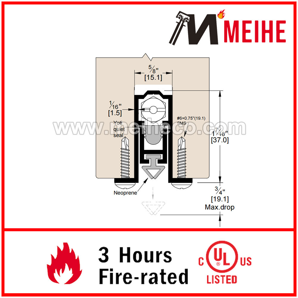 YDB309 fully mortised, standard duty Automatic Door Bottom creates a tight seal at the bottom of door to prevent infiltration of light, sound, drafts and more. It is fitted with a solid neoprene extrusion with a high quality mechanism that has been successfully tested through 5 million cycles! Can fill gaps up to 0.75" and is fire rated.