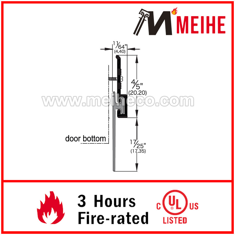 This door sweep can be used to seal up to a 17/25" the gap between the door and threshold or to the floor surface. It is fitted with a Vinyl extrusion. Its fire and smoke rated and can be rated for low VOC Emission. Available in choice of aluminum finishes and is custom cut to size.